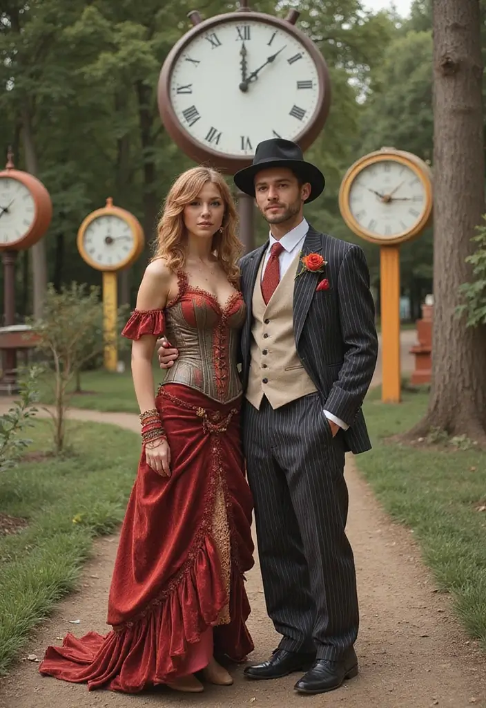 Why pick one era when you can explore them all? Mix a Victorian corset with a futuristic metallic look for a fun “past meets future” vibe. Add goggles, pocket watches, and clock props to tie it together.