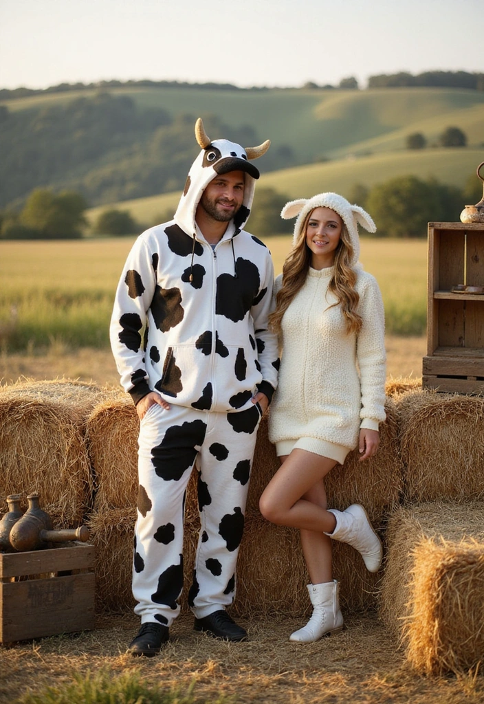 Keep things cute and cozy with matching farm animal costumes. Try a cow and sheep combo—or mix it up with a farmer and their favorite barnyard buddy.