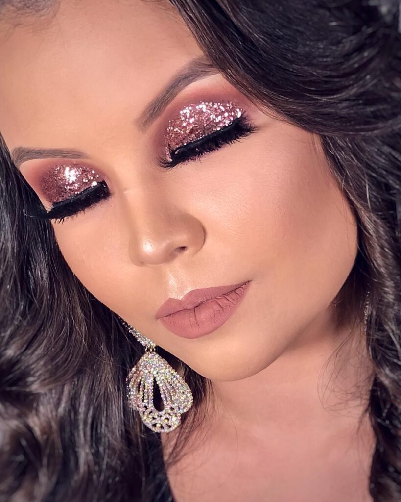 For understated elegance, try rose gold eyeshadow paired with radiant, dewy skin.