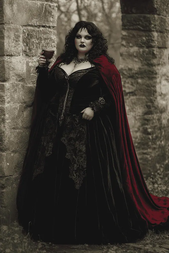 Elegant, dramatic, and deliciously dark. Slip into a black or crimson velvet dress, add a sweeping cape, fangs, and maybe a few drops of fake blood. Finish with a bold lip and choker for a glamorous creature-of-the-night look.