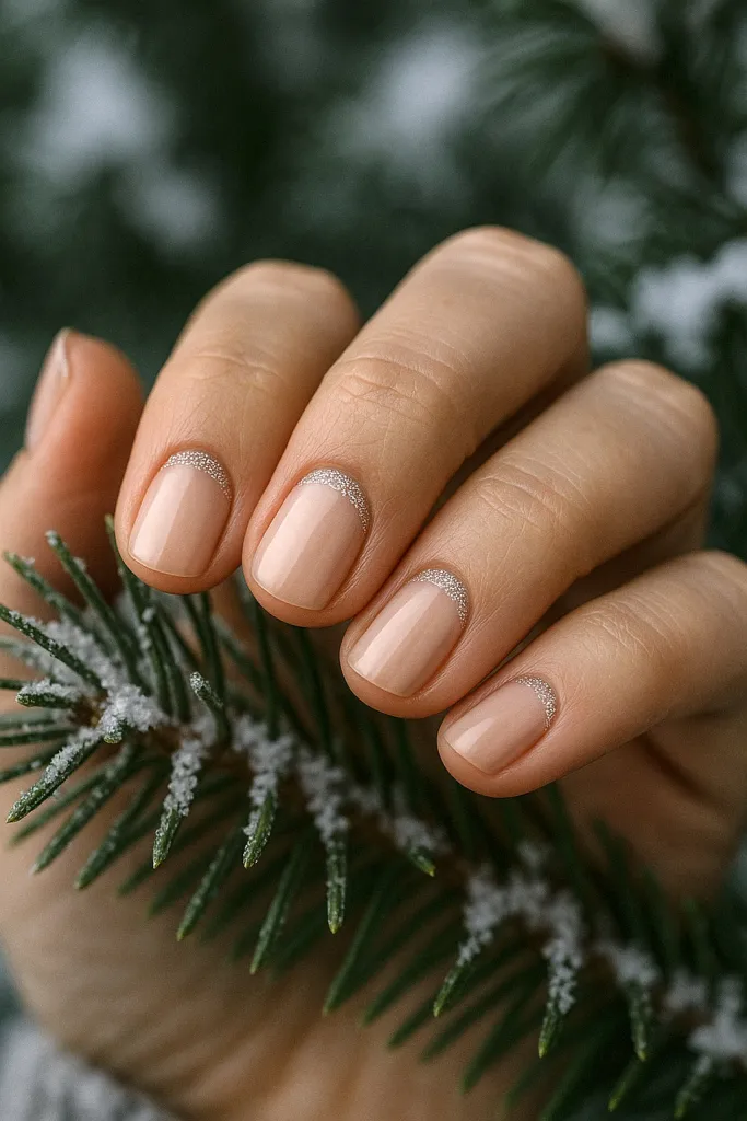 A subtle touch of silver glitter along the cuticle transforms simple nude nails into a sophisticated holiday manicure. Truly a “less is more” masterpiece—so elegant!