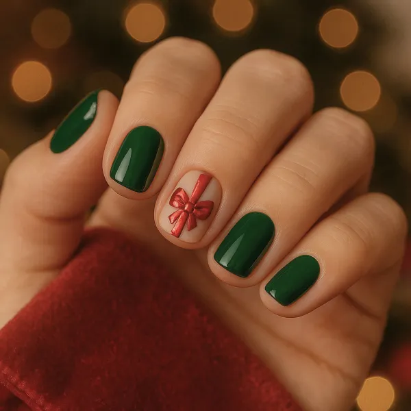 Classic green nails paired with a cute red bow accent nail create a charming gift-wrapped effect. Yes, it’s cliché—and absolutely adorable.