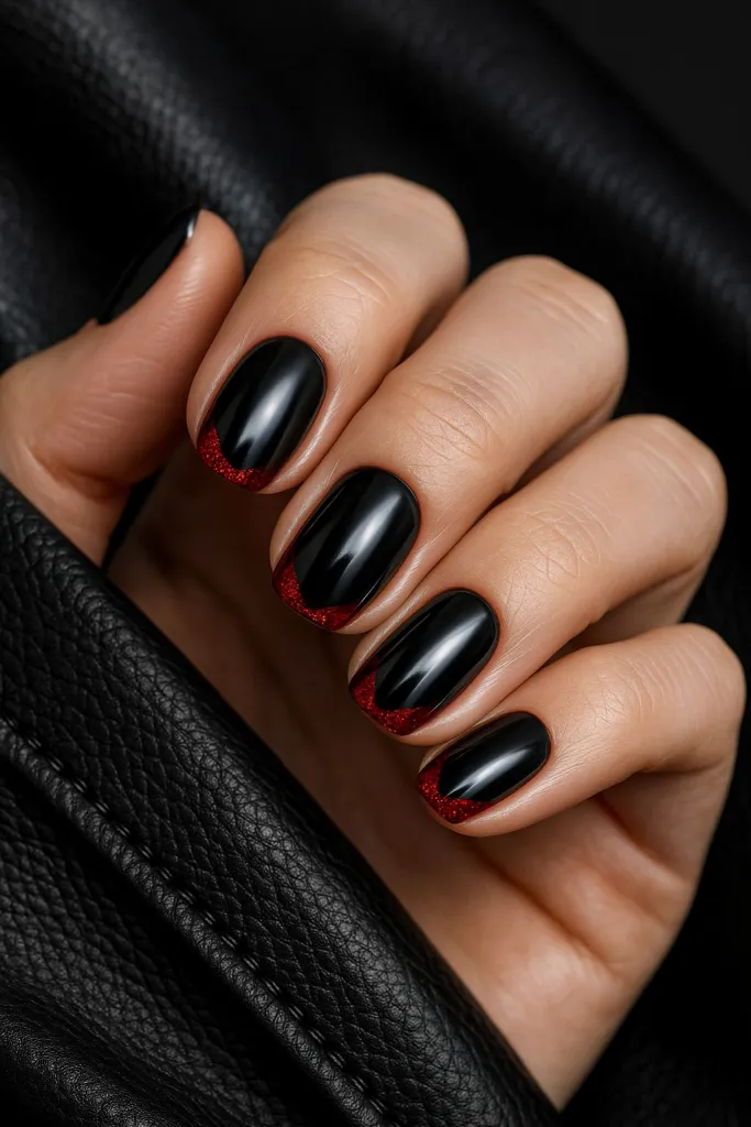 Black Nails with Red Glitter French Tips