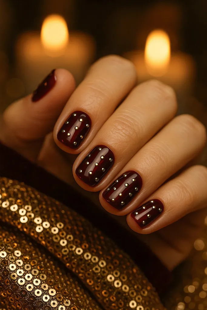 Glossy red nails adorned with chic gold studs are glamorous, bold, and beautifully festive. One of my top picks—rhinestone dots are next-level cute and glam.