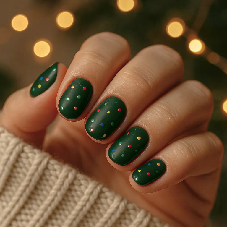These matte green Christmas nails with colorful polka dots capture playful holiday charm. Chic and fun, they pair beautifully with cozy winter outfits.