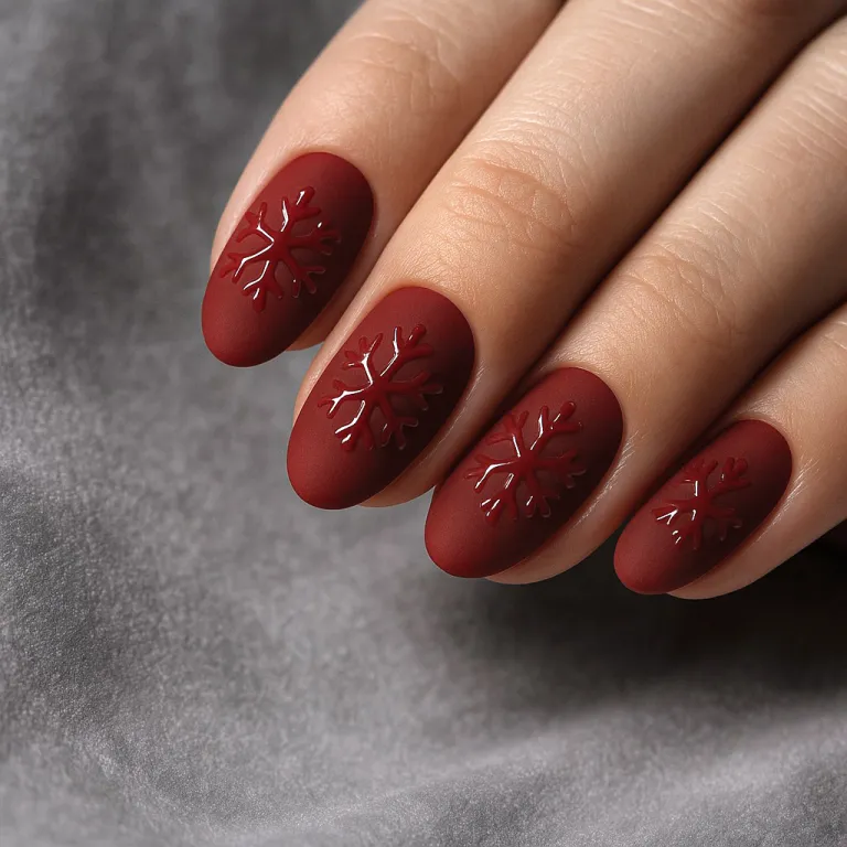 Short burgundy matte nails with embossed snowflakes create an elegant and cozy winter vibe. A perfect pick for holiday dinners and festive gatherings. I love the contrast between the matte and glossy textures.