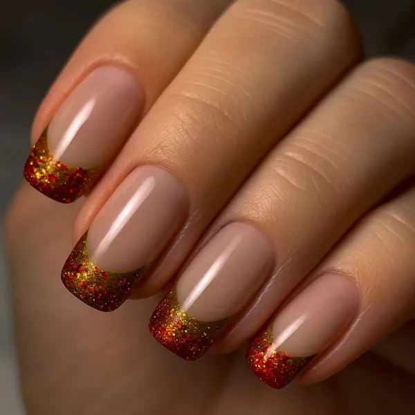 This glittery red-and-gold French manicure is glamorous, festive, and perfect for holiday parties. A timeless blend of elegance and sparkle.