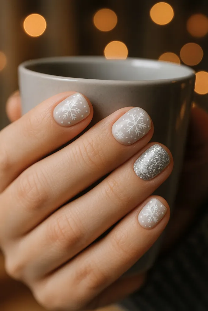 Delicate snowflakes on a soft white base paired with a silver glitter accent nail create a dreamy winter wonderland look.