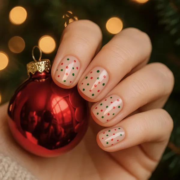Cute Nude Nails with Red & Green Polka Dots