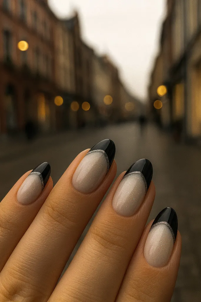 These short almond nails feature bold black French tips with a silver glitter accent—modern, edgy, and sophisticated. Honestly, I’d wear this design all year long.