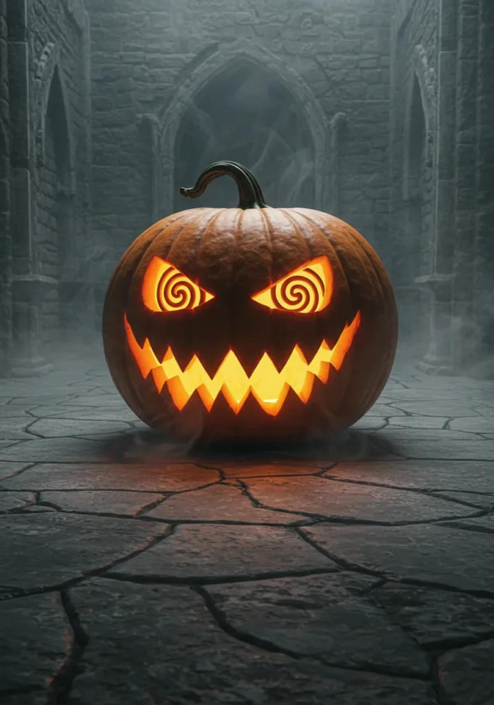 Similar to the hypnotic version, this pumpkin features eerie spiral eyes—but this time, place it in a foggy courtyard. The swirling mist and glowing grin give it an old ghost-story vibe.