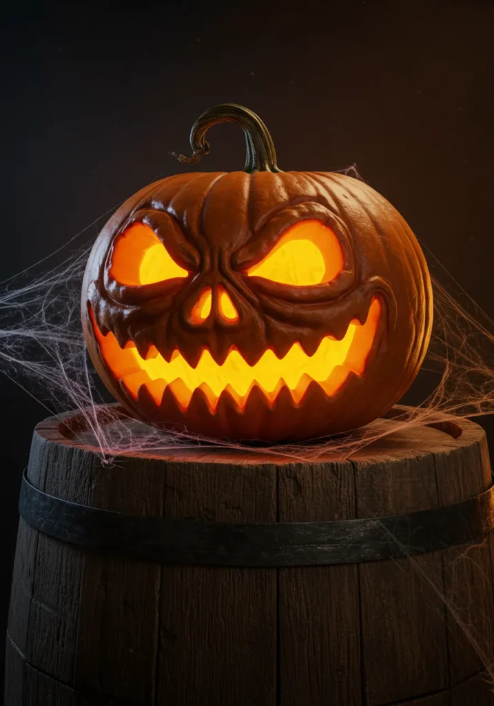 Set a pumpkin with a skeletal grin atop a rustic barrel and wrap it in cobwebs. The texture adds instant haunted-barn energy that feels authentic and chilling.