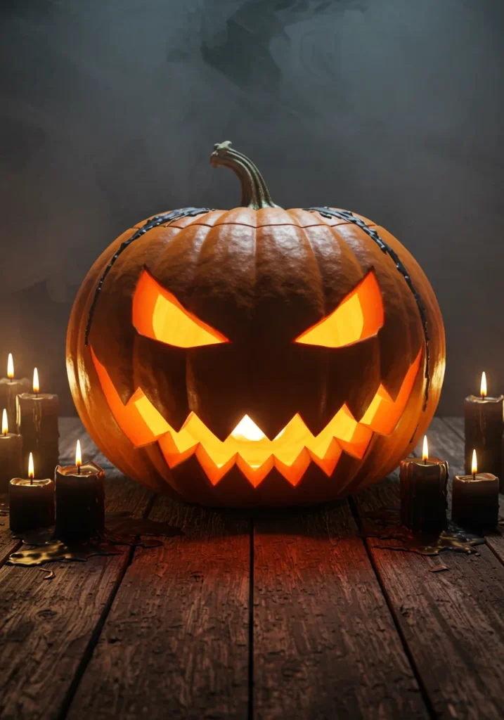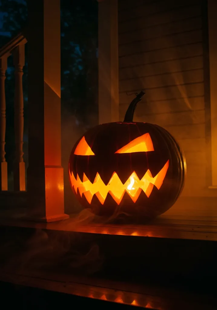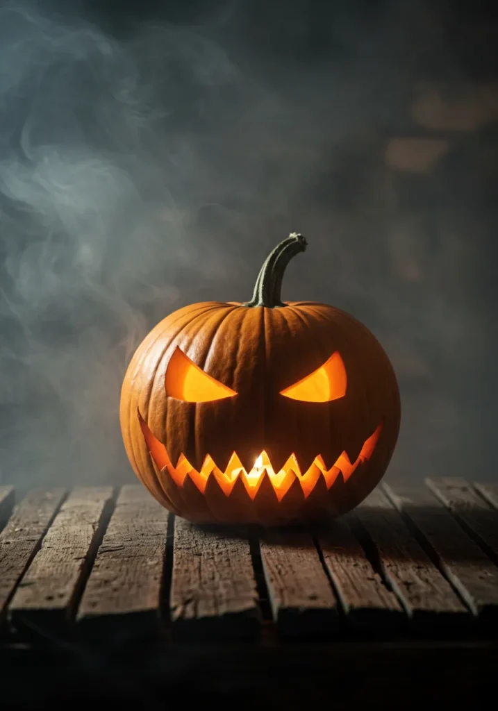 Place a glowing jack o’ lantern on a rustic wooden table and add a touch of mist or fog. Its piercing eyes will glow brighter through the haze, giving it an eerie storytelling feel.