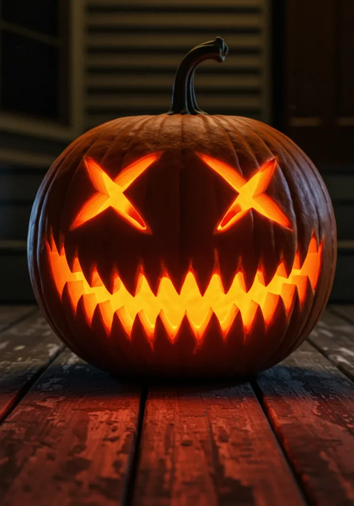 Carve big X-shaped eyes and a huge, toothy smile for a mix of creepy and comical. Set it on your porch and watch it glow like it’s laughing at its own evil joke.