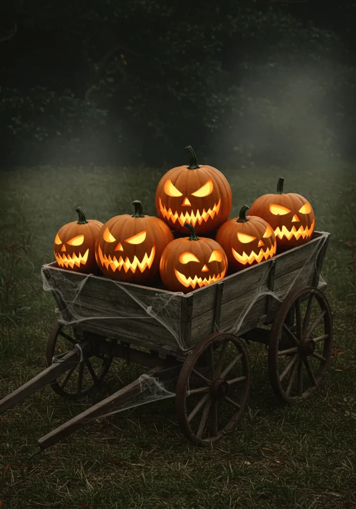 A wooden wagon overflowing with glowing jack o’ lanterns creates instant Halloween magic. Each pumpkin’s wicked grin and jagged teeth make it look like the cart rolled straight out of a nightmare. Add some cobwebs, and you’ve got a haunted parade on wheels.