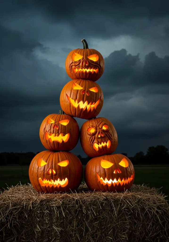 Stack pumpkins high on a bed of hay, each carved with its own terrifying face. Together, they form a glowing army of pumpkin guardians under the night sky.