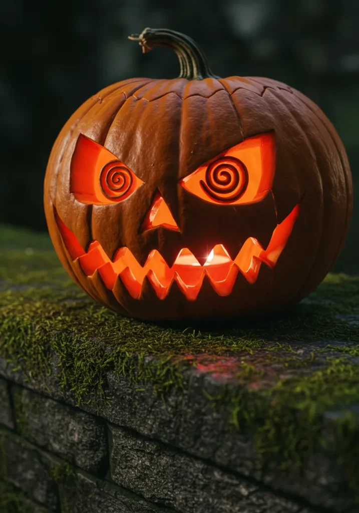 This design is equal parts fun and freaky. Carve swirling spiral eyes and a jagged grin, then set your pumpkin on a mossy stone ledge. It’ll feel like it’s staring straight into your soul.