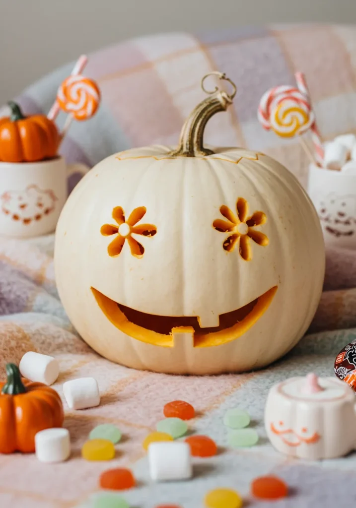 A creamy white pumpkin with daisy-shaped eyes and a wide grin surrounded by colorful candy—this one’s pure joy.
