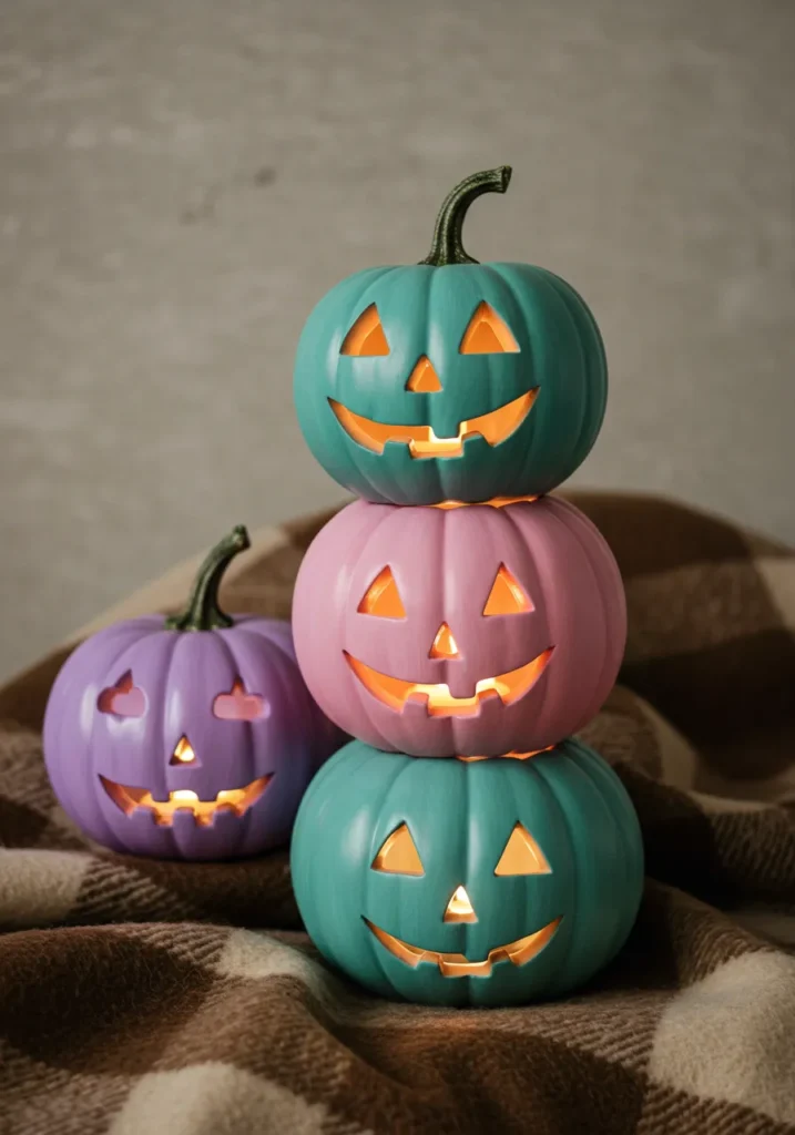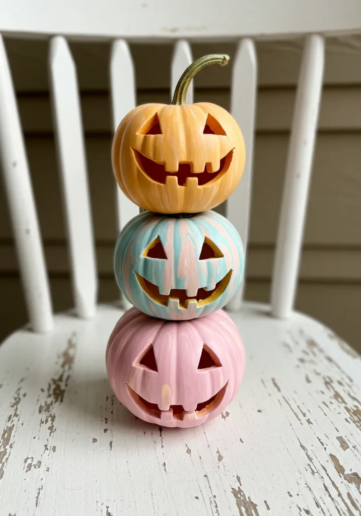 Stack pumpkins painted in blush, peach, and baby blue for a charming, toy-like display. Classic carved faces keep it traditional, while the colors make it pop.