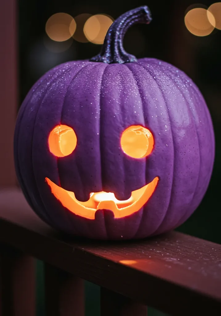 A deep purple pumpkin coated in glitter, with round eyes and a cheeky grin—this one absolutely shines.