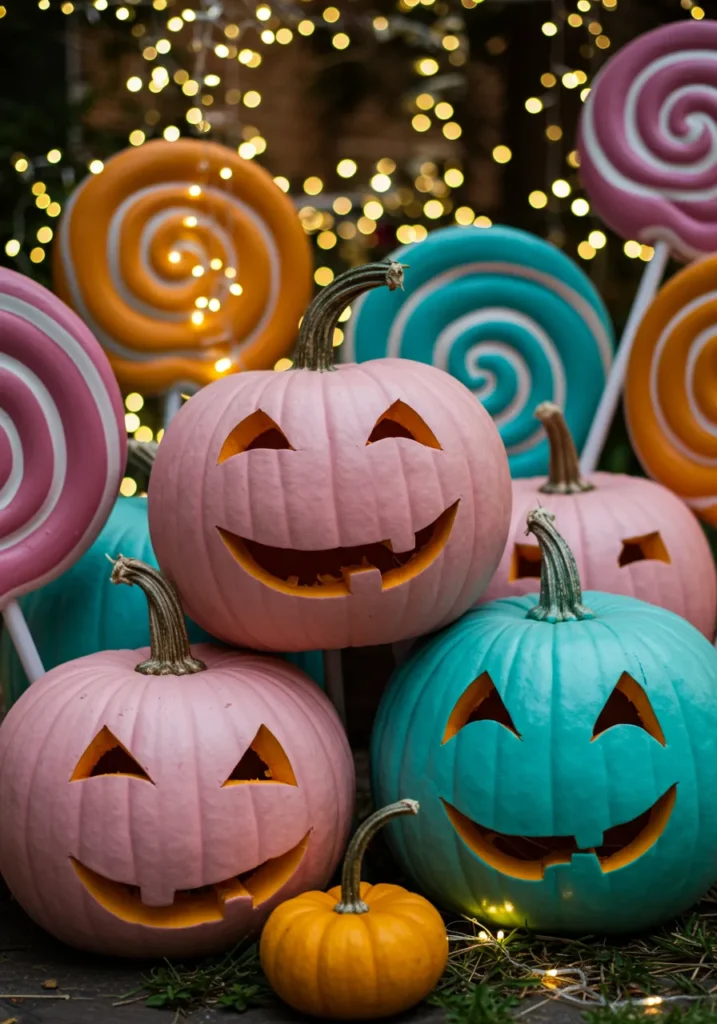 Paint your pumpkins in pastel pinks and teals, surround them with oversized lollipops and fairy lights, and you’ve got a Halloween display straight out of Candy Land.