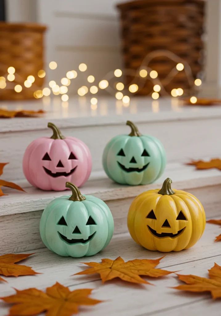 Painted in mint, pink, and yellow, these smiling pumpkins glow softly under twinkling fairy lights.