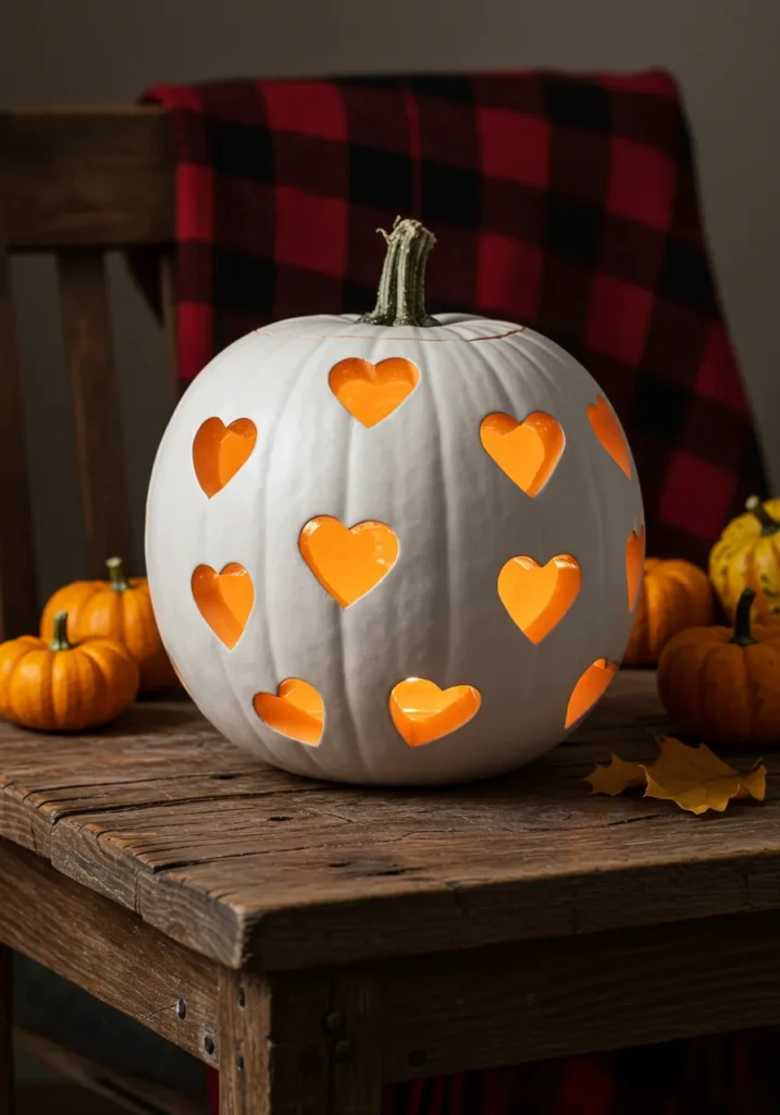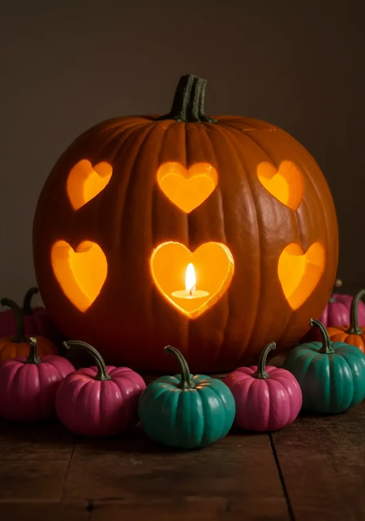 A simple orange pumpkin carved with hearts of varying sizes, surrounded by tiny pastel pumpkins, makes for a sweet and heartfelt centerpiece.