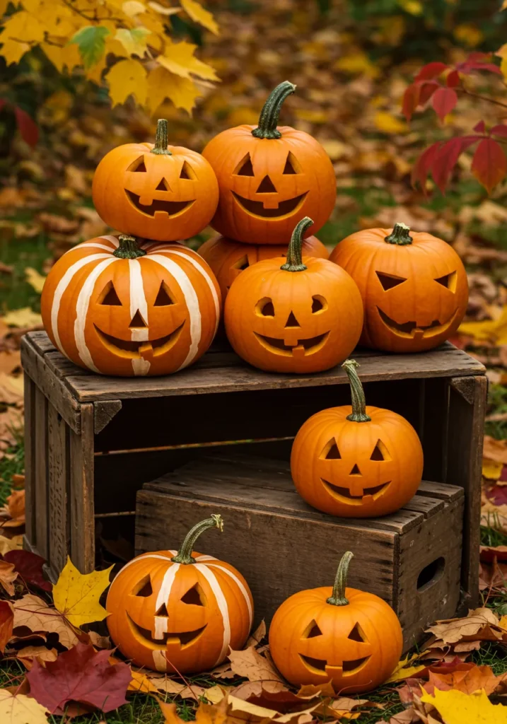 A group of smiling pumpkins arranged on wooden crates among autumn leaves—each with its own quirky face and style.