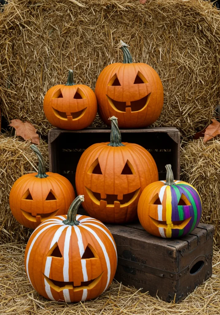 These cheerful pumpkins look like they’re having a party right on the hay bales! With triangle eyes, wide toothy grins, and splashes of bright paint, they turn a simple porch into a happy little pumpkin family.
