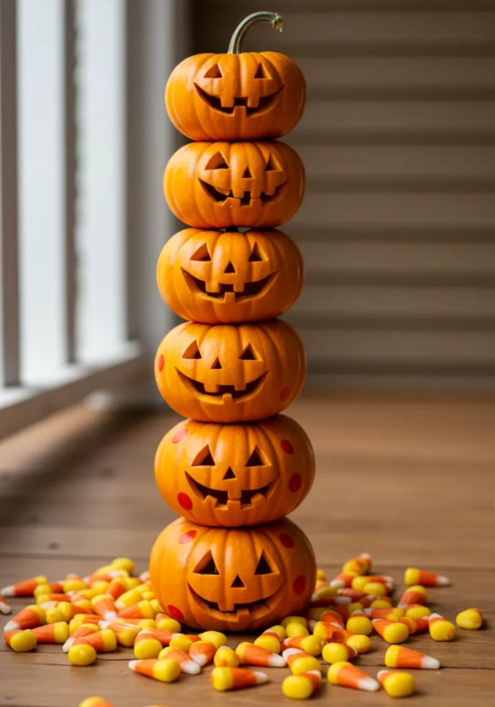 Stack five classic pumpkins to create a glowing “totem pole” of happy faces. Each one wears a unique grin, and a sprinkle of candy corn at the base ties it all together.