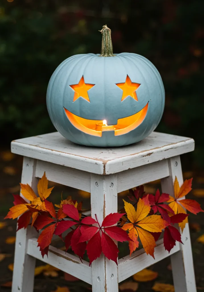 Painted a soft sky blue, this pumpkin features star-shaped eyes and a wide, glowing smile. Nestled among autumn leaves, it sparkles with a storybook kind of magic.