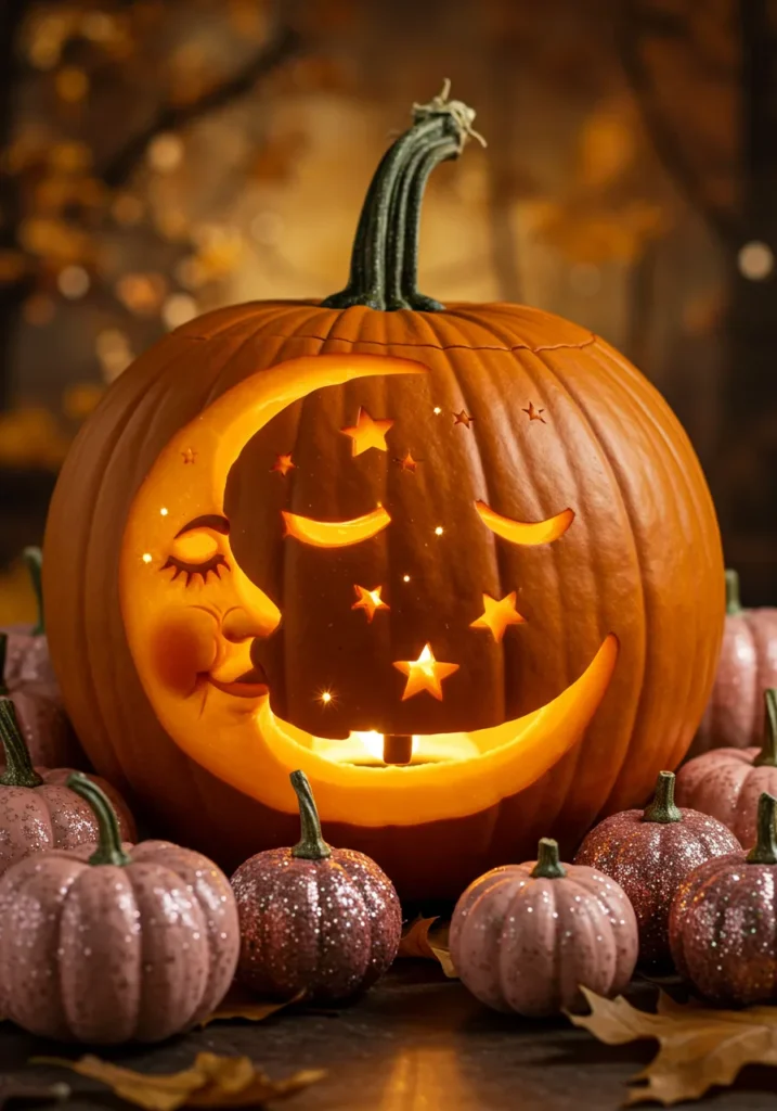 A crescent moon carved with a serene face surrounded by tiny stars—this one’s pure elegance. Add glittery mini pumpkins at the base for extra sparkle.