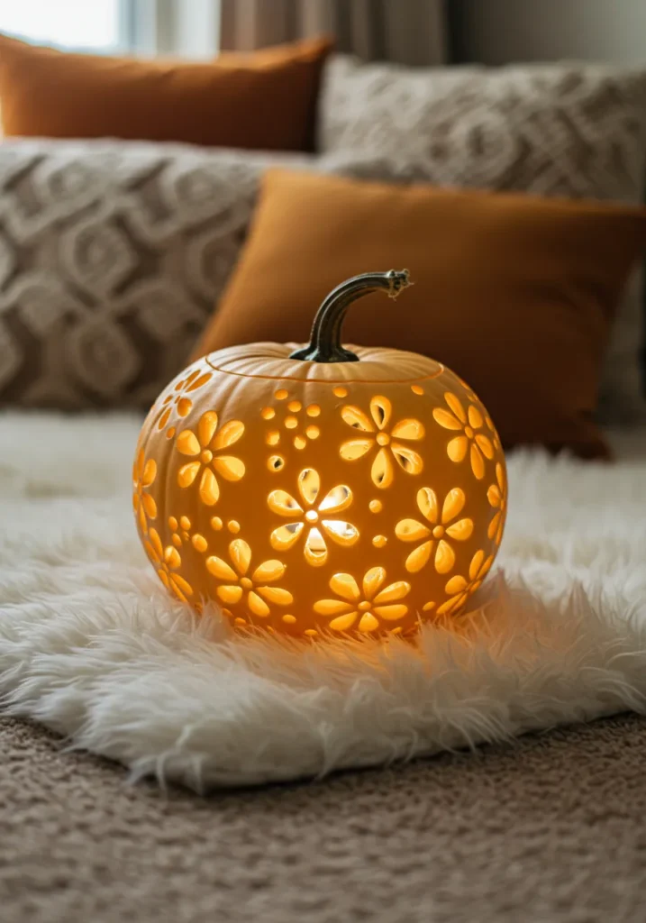 This delicately carved pumpkin features glowing flower cutouts that look almost lace-like. Set among pillows or cozy blankets, it gives off major boho-lantern vibes.