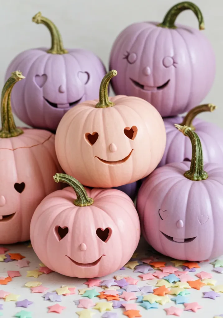 Soft pink and lavender pumpkins with heart eyes and sweet smiles? Yes, please! Add star confetti for a dreamy fairytale touch.