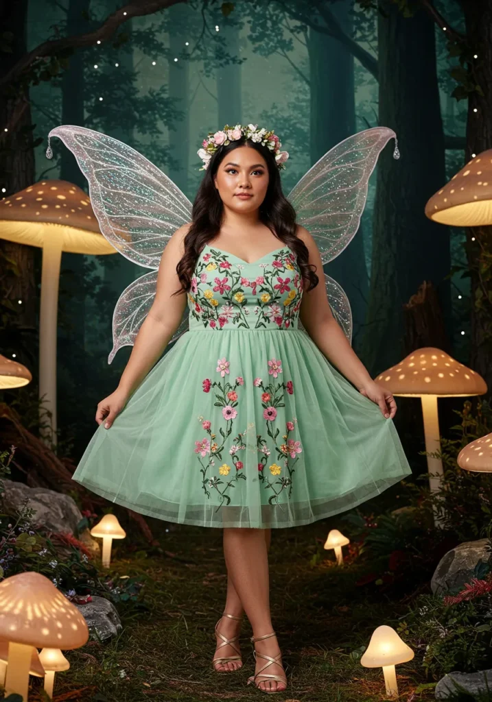 This dreamy fairy look feels straight out of a storybook. A pastel green dress with colorful floral embroidery twirls beautifully, while shimmering wings and a flower crown complete the whimsical vibe.