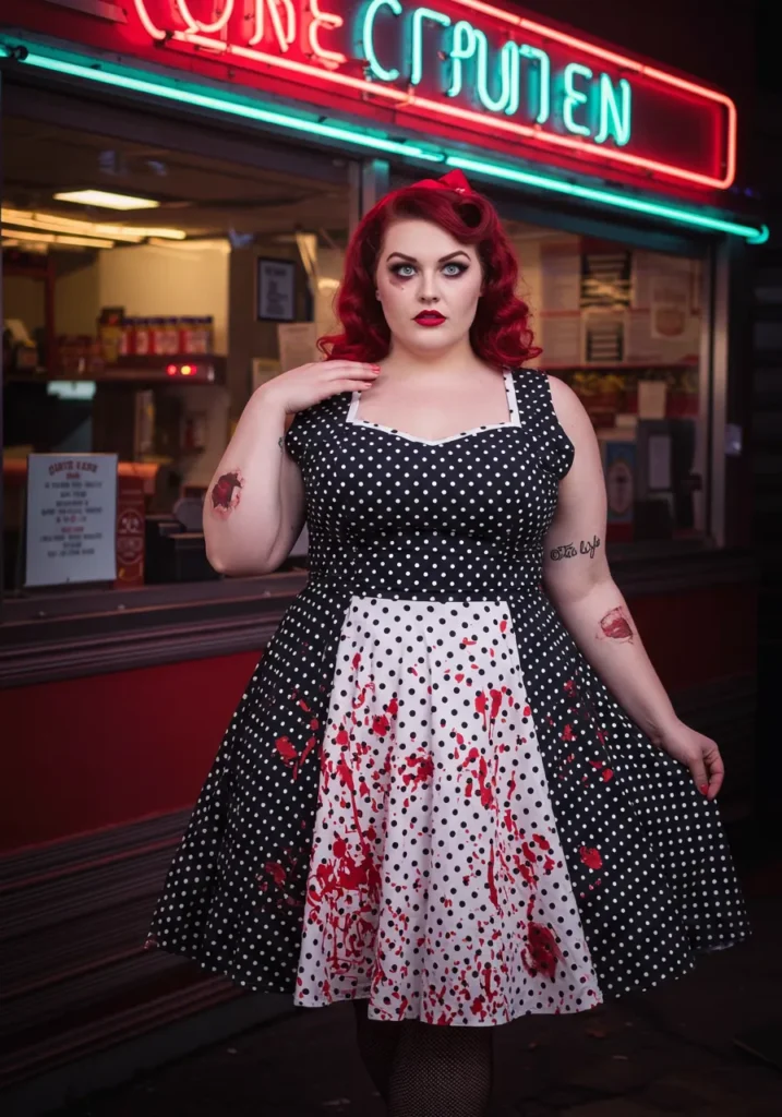Mix vintage charm with Halloween edge — a polka-dot pinup dress splattered with faux blood, retro curls, and red lipstick for contrast.