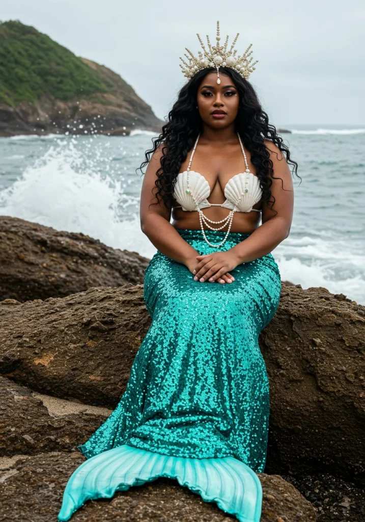 Dive into fantasy with a sequined teal tail skirt, seashell top, and pearl accessories. Add glittery makeup to complete your siren style.