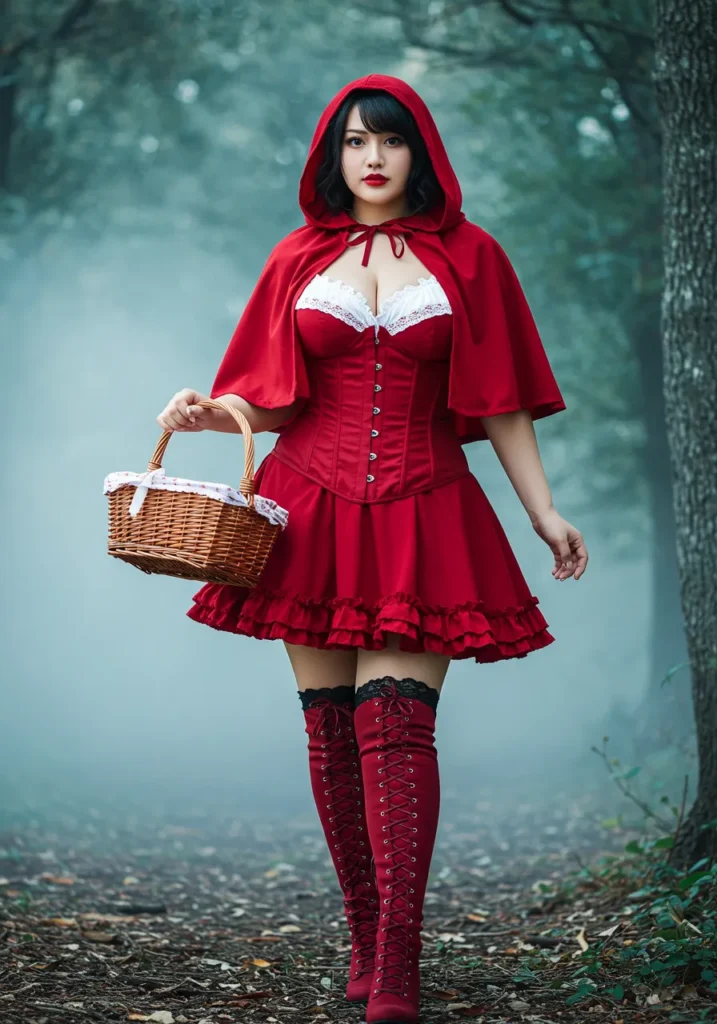 This sultry twist on a fairy tale favorite features a fitted corset dress, red cape, and lace-up boots. A woven basket adds a playful touch.