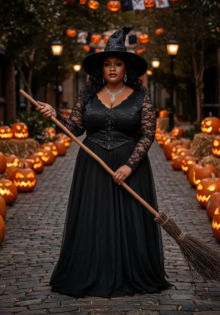 A flowing black gown, lace sleeves, and a tall pointed hat create timeless witchy elegance. Accessorize with statement jewelry and a broomstick.