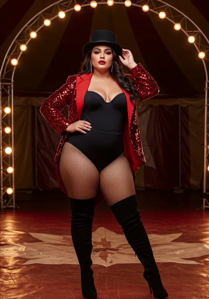 Take center stage in a sequined red jacket, black bodysuit, and top hat. Fishnets and thigh-high boots give it that daring circus flair.