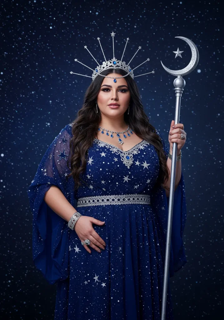 A deep blue gown covered in stars, a silver crown, and a crescent moon staff bring cosmic glamour to life.