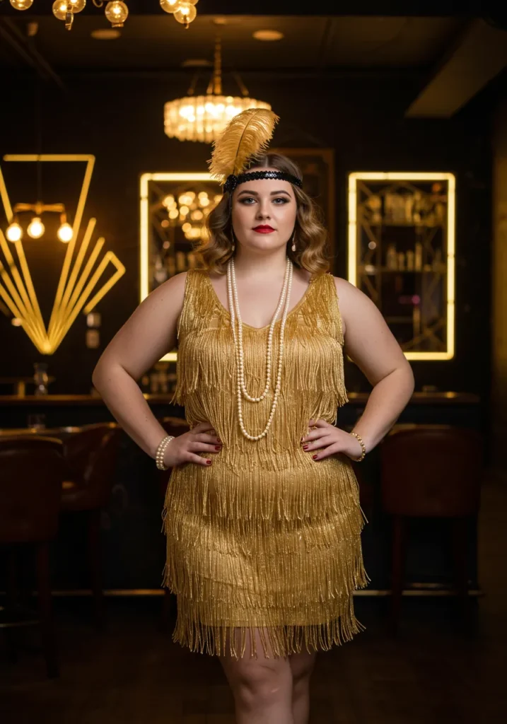 Channel the Roaring Twenties with a gold fringe dress, layered pearls, and a feathered headband. Retro waves and a bold lip add the finishing touch.