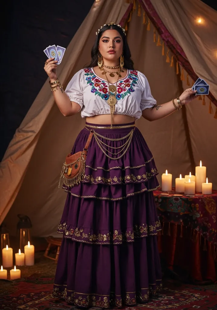A flowing purple skirt with gold trim and an embroidered cropped blouse brings this look to life. Add bold jewelry, layered chains, and a tarot deck for authenticity.