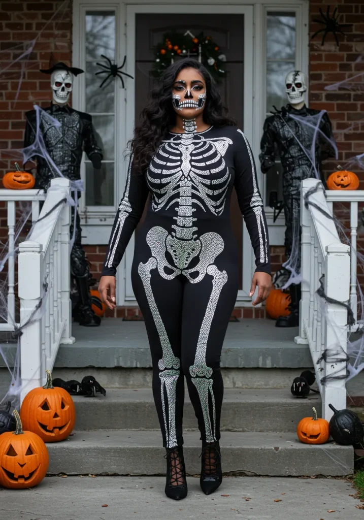 A rhinestone skeleton jumpsuit brings this spooky classic to life. The glittering bones against a sleek black base are both edgy and flattering.