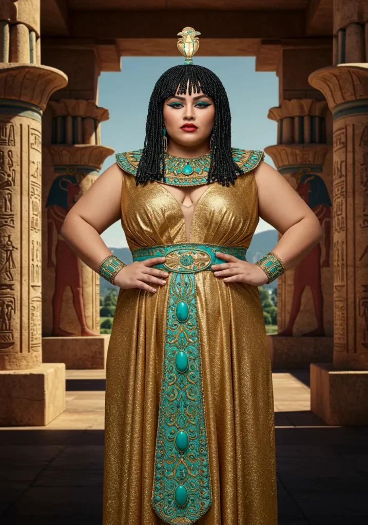 Step into your queen era with a gold gown, turquoise accents, and a jeweled collar. The sleek wig and dramatic eyeliner complete the iconic look.