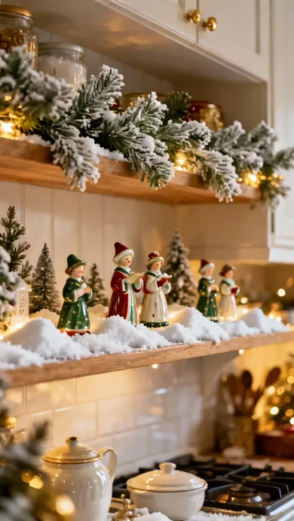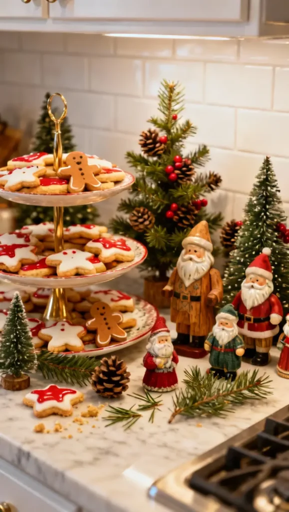 Turn your countertops into a festive showcase. Use tiered cake stands stacked with homemade cookies, add small evergreen trees for height, and weave in vintage Santa figurines for a nostalgic touch.