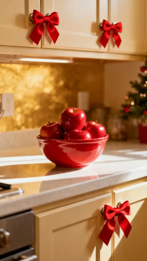 Quick changes can make a big impact. Tie red bows onto cabinet knobs and place a bowl of shiny red apples on the counter. Simple, cheerful, and effective.