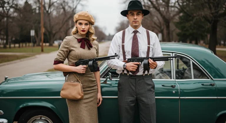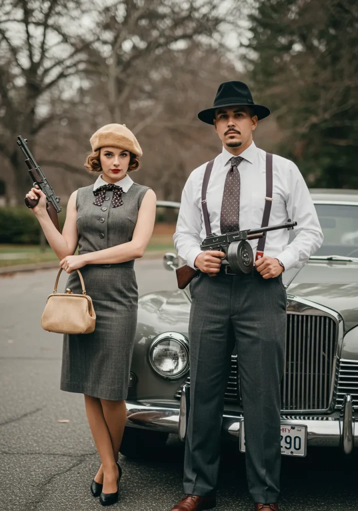 Vintage outlaw energy at its finest. Think sharp suits, berets, and prop tommy guns for a cinematic touch.