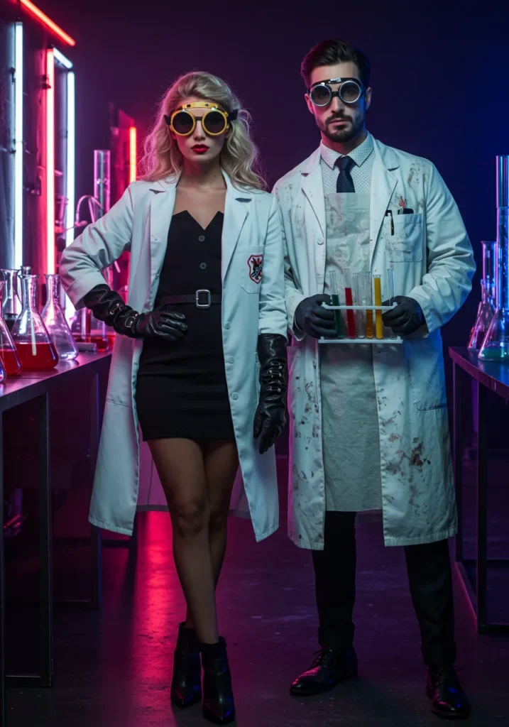Channel chaotic brilliance with lab coats, goggles, and neon props.