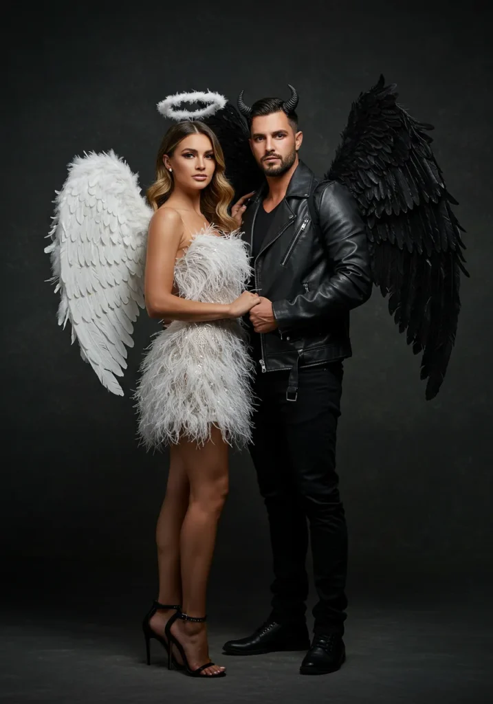 Opposites attract. She shines in white feathers and a halo; he smolders in black leather and horns.